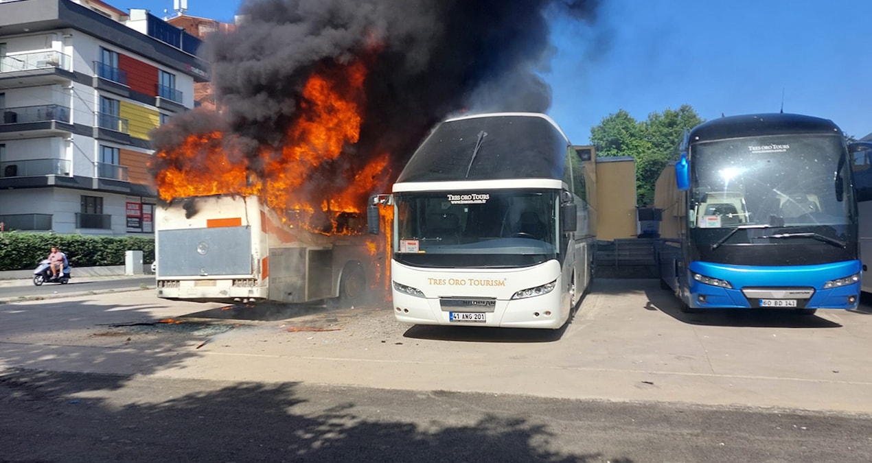 Gebze’de otoparkta, park halinde bulunan tur otobüslerinden biri, henüz bilinmeyen nedenle alev aldı.