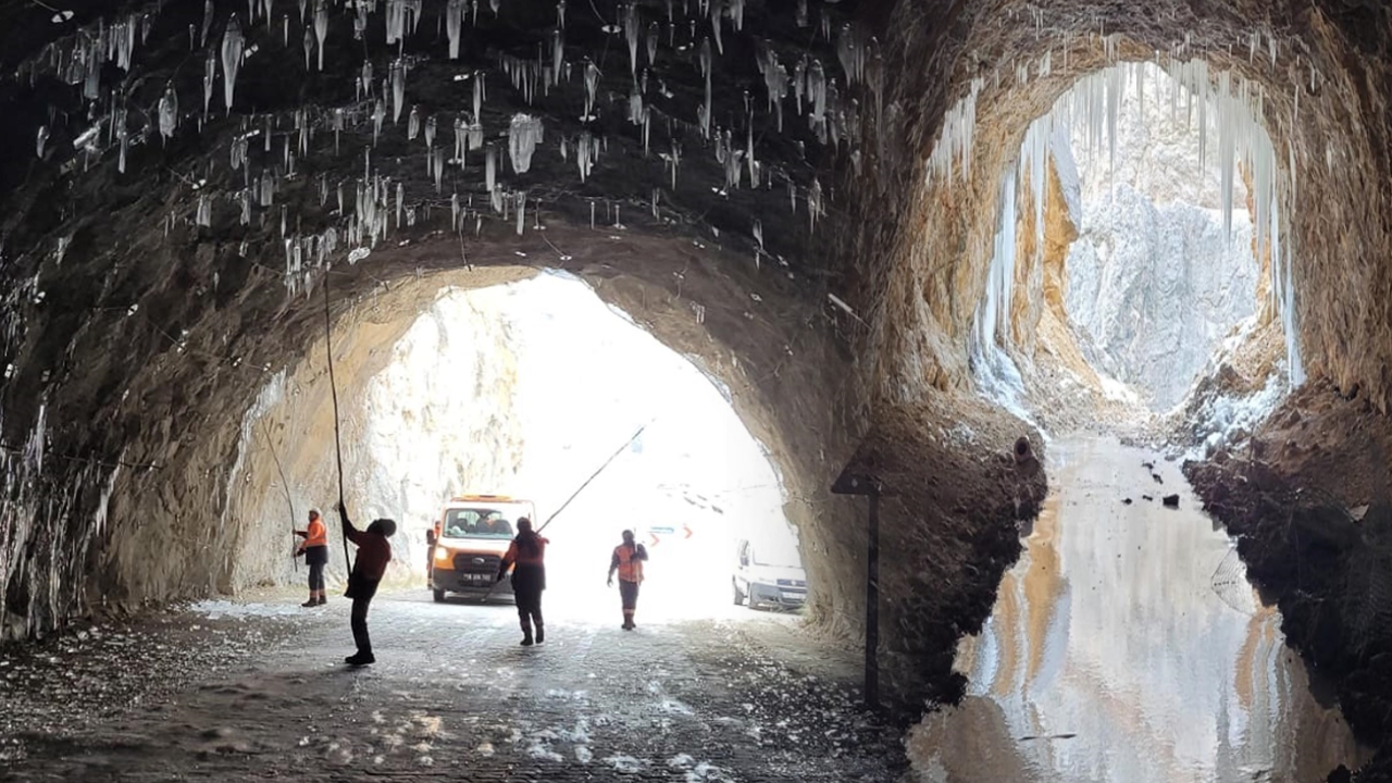 Fırat Nehri kıyısında Kemaliye’den Divriği ilçesine uzanan 7 kilometrelik taş yoldaki tüneller, soğuk hava nedeniyle buz sarkıtlarıyla kaplandı. Tünellerde ulaşımı tehlikeye sokan buz sarkıtları, Kemaliye Belediyesi ekipleri tarafından kırılmaya başlandı. Kırılan buzlar, ekipler tarafından yoldan taşınarak dışarı atılıyor.