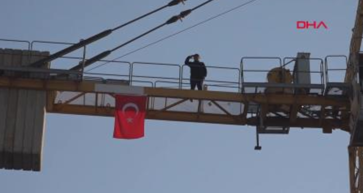 Bahçelievler Mahallesi’nde yapımı devam eden Devlet Hastanesi inşaatında görev yapan kule vinç operatör Mustafa Ağır, 80 metre yükseklikte çalıştığı sırada, siren seslerini duyunca işi bırakıp kabinden çıkarak, saygı duruşuna geçti.