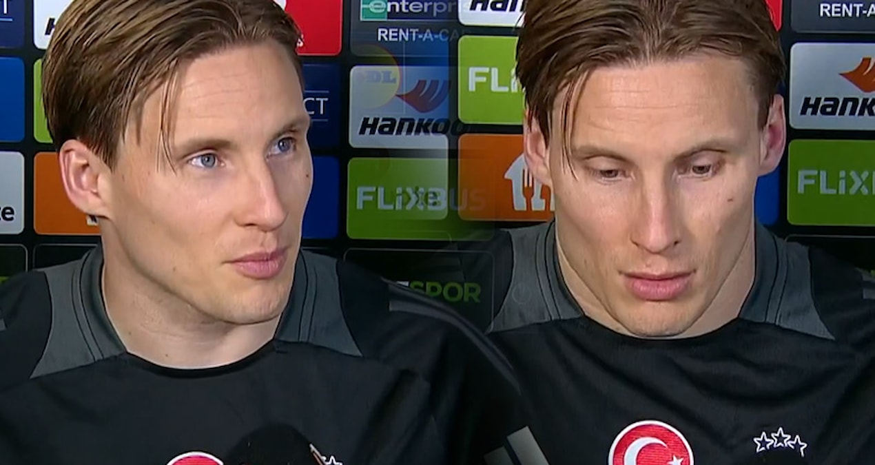 Beşiktaş’ın Norveçli sağ bek oyuncusu Jonas Svensson, Avrupa Ligi’nde İsveç ekibi Malmö’ye karşı alınan 2-1’lik galibiyet sonrası Türkçe röportaj verdi. Kısa süre önce ülkemize gelen yıldız futbolcunun iyi Türkçe’si sosyal medyada gündem yarattı.