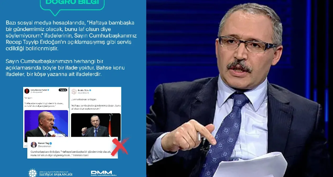 “Bazı sosyal medya hesaplarında, ‘Haftaya bambaşka bir gündemimiz olacak, bunu laf olsun diye söylemiyorum’ ifadelerinin, Sayın Cumhurbaşkanımız Recep Tayyip Erdoğan’ın açıklamasıymış gibi servis edildiği belirlenmiştir. Sayın Cumhurbaşkanımızın herhangi bir açıklamasında böyle bir ifade yoktur. Bahse konu ifadeler, bir köşe yazarına ait ifadelerdir.”