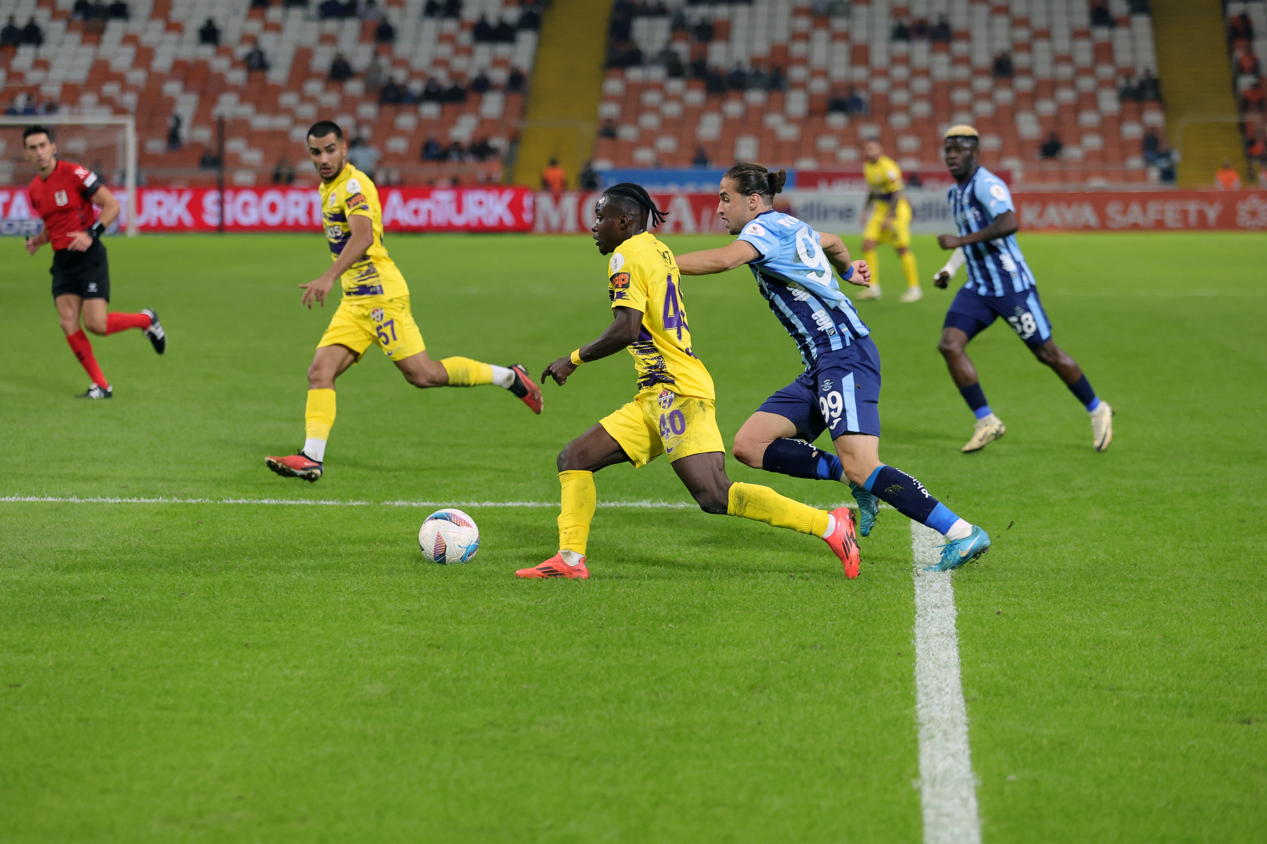 70. dakikada Adana Demirspor frikik kazandı. Yusuf Sarı’nın kullandığı serbest vuruşta meşin yuvarlak yandan auta gitti.
