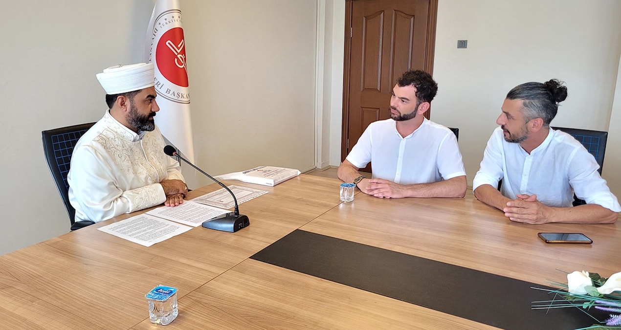 Priamo’ya ihtida belgesi ve Kur’an-ı Kerim veren Müftü Çiçek, “Müslüman olan kardeşimizi tebrik ediyorum, Rabb’im yeni hayatında rızasına uygun yaşam sürdürmeyi nasip etsin.” dedi.