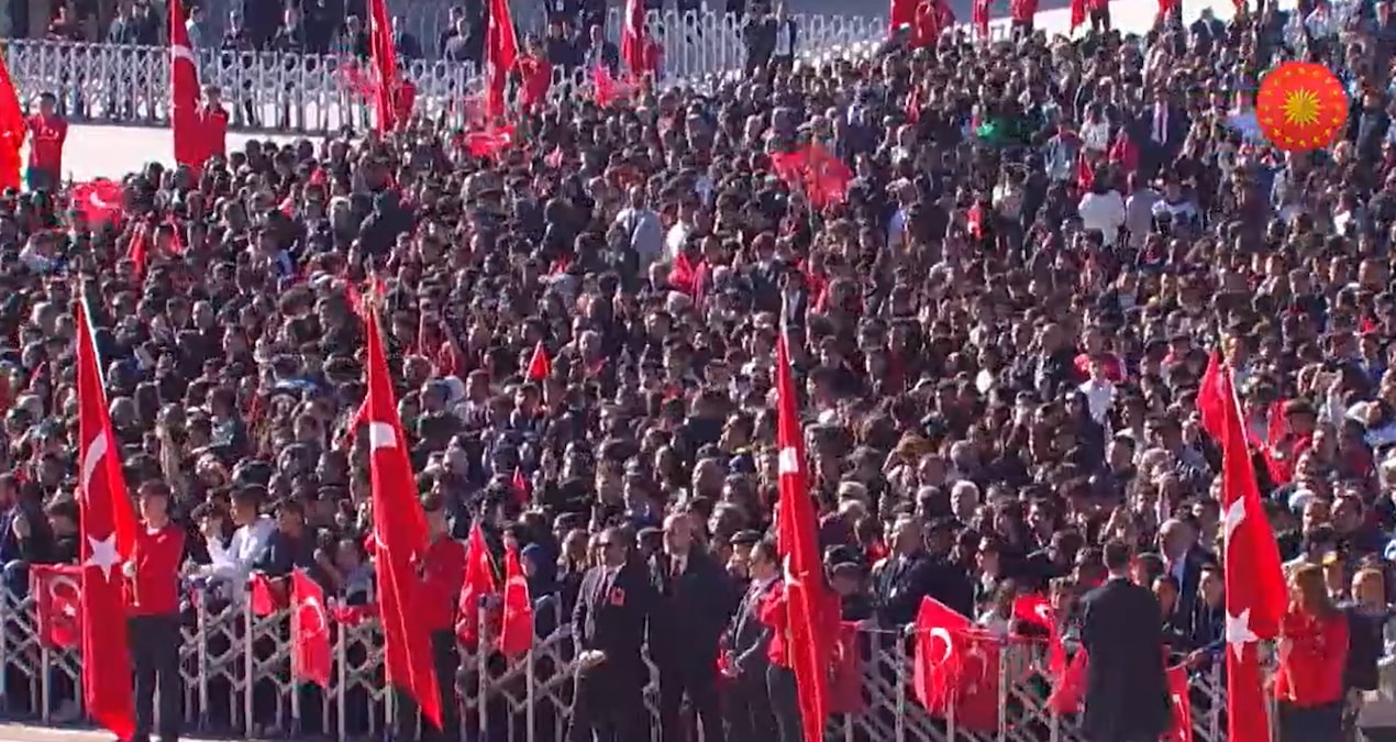 Saat 11.00’de Aslanlı Yol’da yürüyüşe geçen kortejde CHP Genel Başkanı Özgür Özel ve MHP Genel Başkanı Devlet Bahçeli de yer aldı. Kabine üyeleri, yüksek yargı organları ile siyasi parti temsilcilerinin de yer aldığı kortejin hareket etmesiyle başlayan törende ilk olarak Erdoğan, Atatürk’ün mozolesine ay-yıldız motifli çelengi bıraktı. Saygı duruşunun ardından İstiklal Marşı okundu.