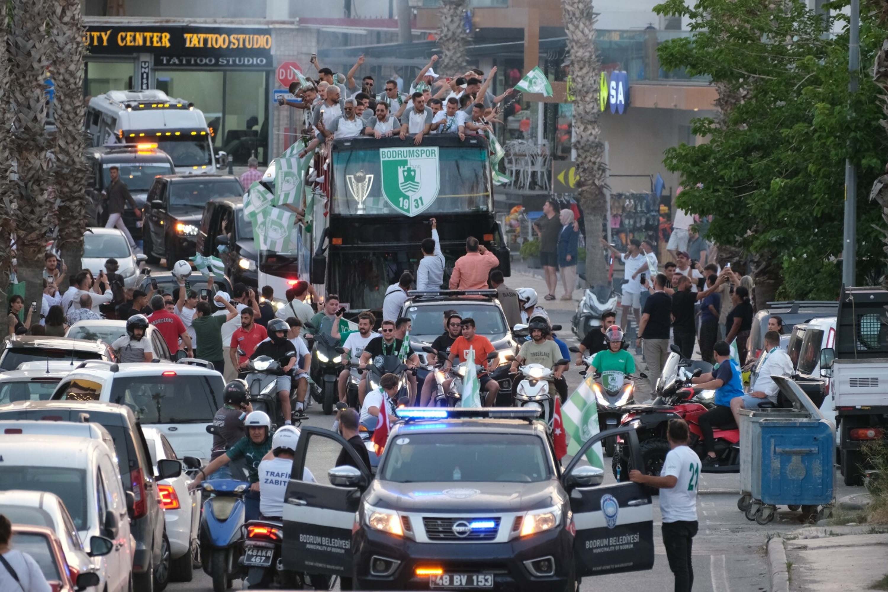 Amatör kümeden 4 lig birden atlayıp bir zamanlar hayali bile kurulamayan Süper Lig’e ulaşan Bodrum FK, coşkulu kutlama programına imza attı. Futbolcular ve teknik ekip üstü açık otobüsle kentte tur atarken, taraftarlar meşalelerle takıma eşlik etti.