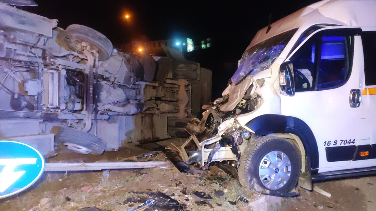 Bursa kara yolu Küçük Sanayi Sitesi kavşağında, Memduh K. (55) idaresindeki 16 S 7620 plakalı servis midibüsü ile Hüseyin S. (53) yönetimindeki 16 S 7044 plakalı servis minibüsü çarpıştı.