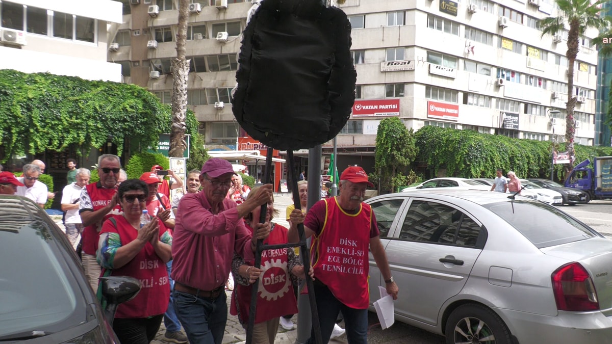 İzmir’de DİSK Emekli-Sen Ege Bölge Temsilciliği üyesi emekliler, bayram ikramiyeleri protesto ederek, Konak ilçesindeki SGK İzmir İl Müdürlüğü önüne siyah çelenk bıraktı. Basın açıklaması yapan emekliler, “Adil, yeterli ikramiye; insan onuruna yakışır emeklilik!” taleplerini dile getirdi.