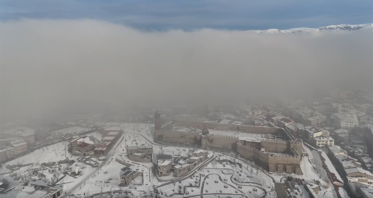 Erzurum’da kar yağışının ardından kent genelinde etkili olan yoğun sis, görüş mesafesini ciddi şekilde düşürdü. Sabah saatlerinde etkisini artıran sis, zaman zaman görüş mesafesini 30 metrenin altına indirdi. Özellikle yüksek kesimlerde seyahat eden sürücüler zor anlar yaşarken, Erzurum’un sembolü olan tarihi yapılar ve kent merkezi sisin içinde görünmez hale geldi. Bu etkileyici manzara, drone aracılığıyla kaydedilen görüntülere de yansıdı.