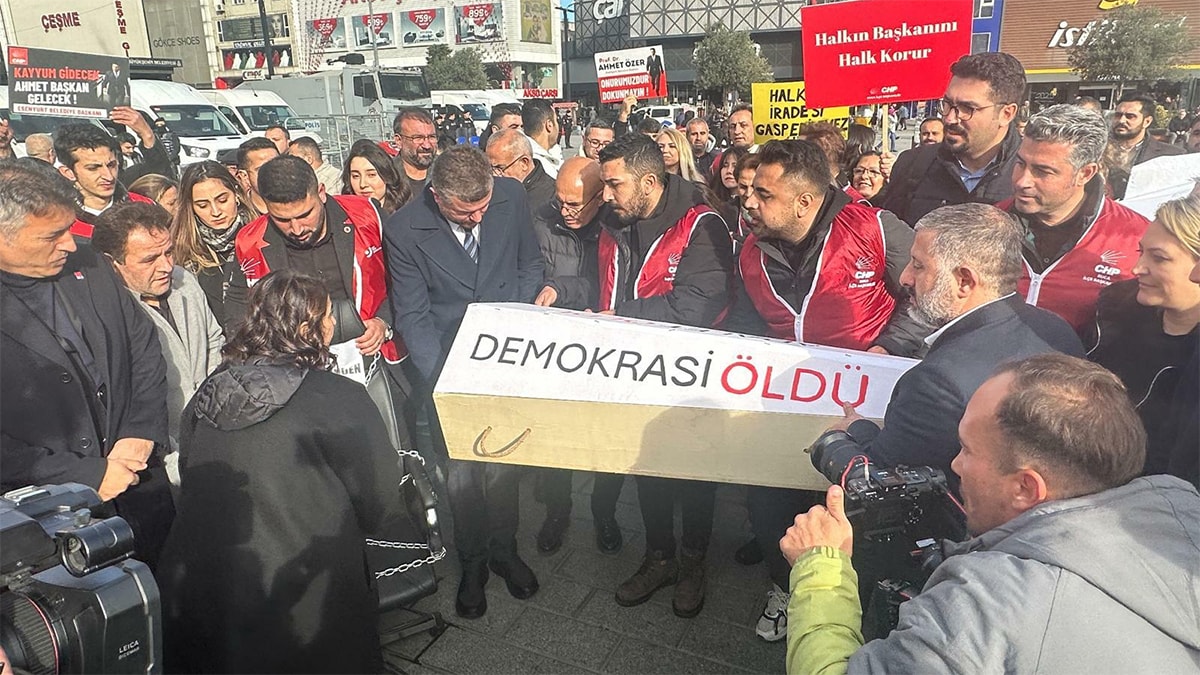 Nöbette, “Gün gelecek, devran dönecek, AKP halka hesap verecek”, “Hak, Hukuk, Adalet” sloganlarının atılırken, CHP Buca İlçe Örgütü nöbet alanına üzerinde “Adalet Öldü” ve “Demokrasi öldü” yazan tabut ve üzerinde “Halkın iradesi elinden alındı” yazılı zincir vurulmuş koltuk ile katıldı.