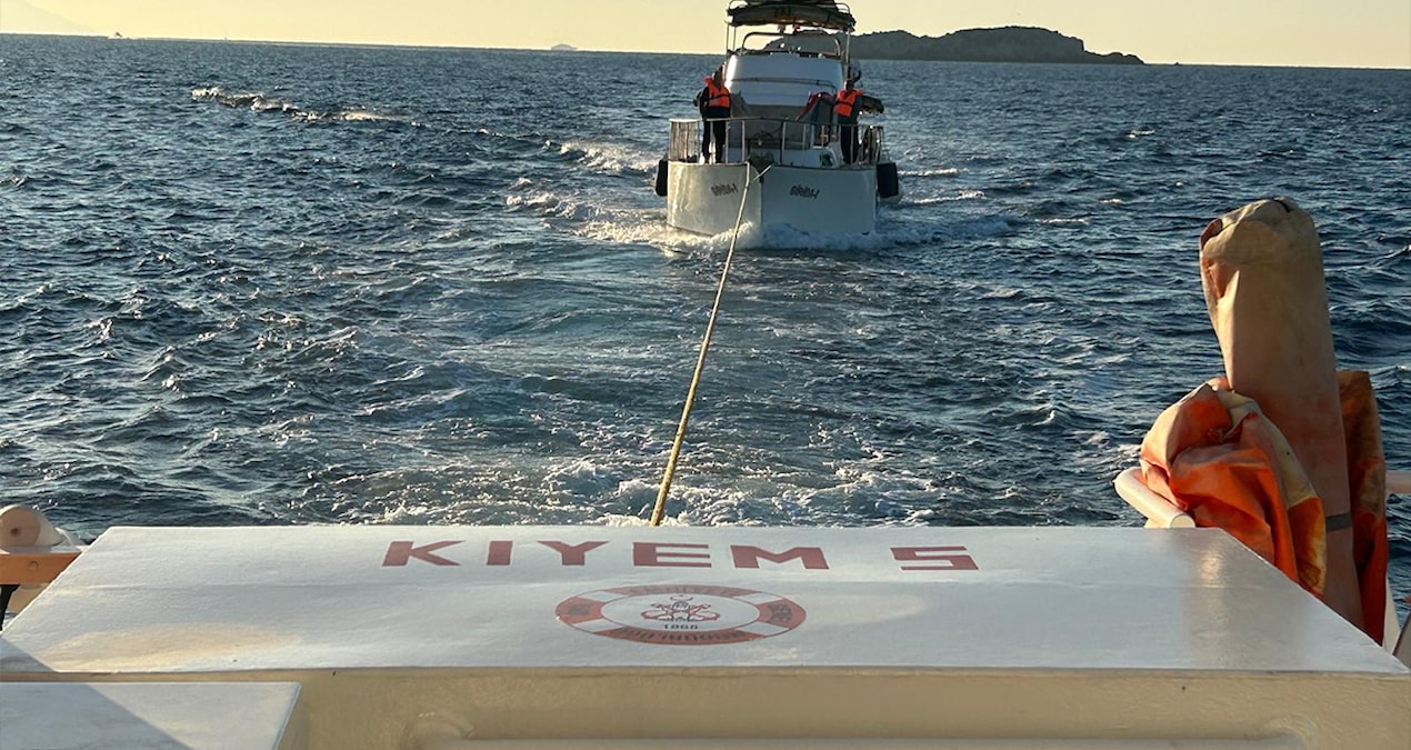 İçinde 4 kişi bulunan 15 metre uzunluğundaki tekne, KIYEM-5 botuyla çekilerek Sarıgerme Mahallesi’ne yanaştırıldı.