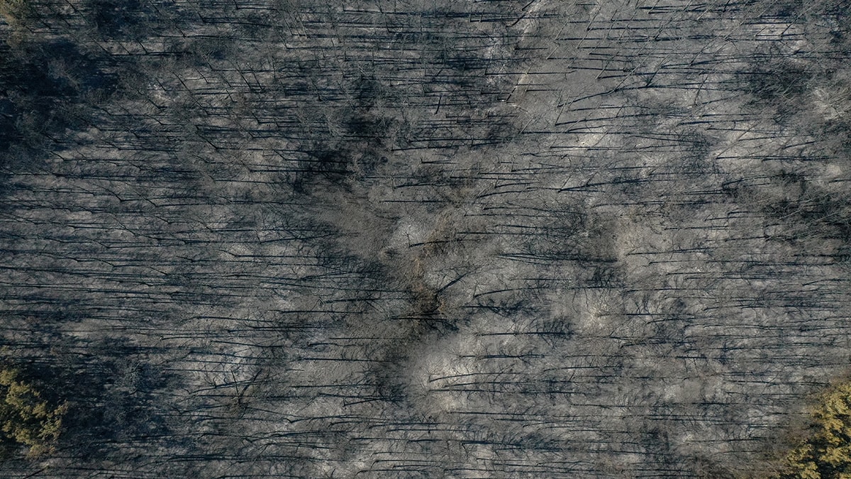 Soğutma çalışması ve hasar tespitinin sürdüğü kampüste yanan ormanlık alan, drone ile görüntülendi.