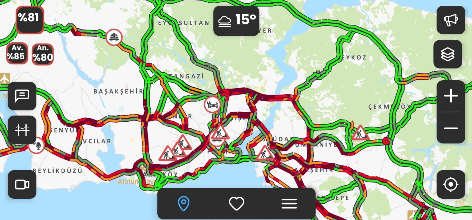 Saat 19.00 sıralarında İstanbul Büyükşehir Belediyesi Trafik Yoğunluğu Haritasında yoğunluk yüzde 81’e ulaştı.