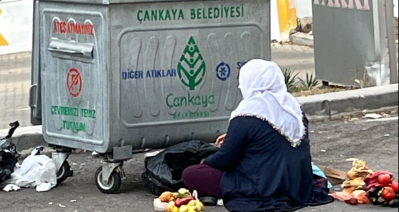 Ankara’da objektiflere önceki gün yansıyan bir kare Türkiye’nin ekonomik durumuna ayna tuttu. Yaşlı bir kadın AKP Genel Merkezi’nin de bulunduğu Balgat Çukurambar semtindeki Taurus AVM’nin yanındaki lüks sitenin çöp konteynerini karıştırdı. Yaşlı kadın daha sonra caddeye oturup çöp bidonundan topladığı çürük sebze ve meyveler ile bayat ekmeklerden yenebilecek olanları ayırdı. Bir torbaya koyup evine götürdü.