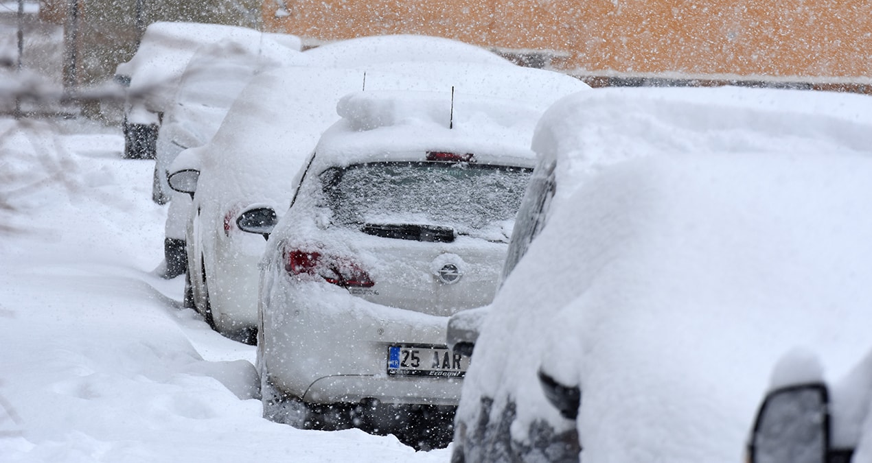 Kar yağışıyla birlikte Erzurum’da hava sıcaklığı sıfırın altında 8 dereceye kadar geriledi. Şehirde cadde ve sokaklar tamamen beyaza bürünürken, park halindeki araçlar karla kaplandı.