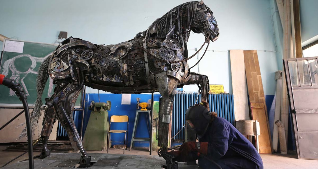 Mimar Sinan Mesleki ve Teknik Anadolu Lisesi metal atölyesinde atın iskeletini oluşturan Can, topladığı malzemeleri atın görünümüne uygun olacak şekilde kaynattı.