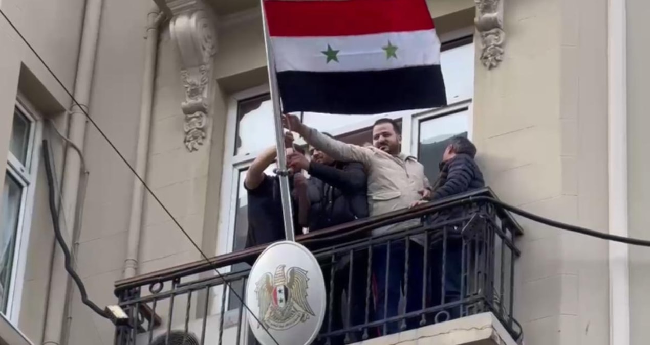Polis ekipleri, çevrede geniş güvenlik önlemleri alırken binanın balkonundaki Esad yönetimine ait bayrak indirildi.