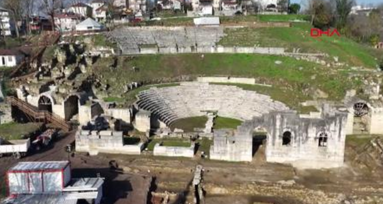 Batı Karadeniz’in tek antik tiyatrosu olma özelliğini taşıyan Konuralp bölgesindeki Konuralp Antik Tiyatrosu’nda tarihi eserlerin gün yüzüne çıkarılması için kazı çalışmaları devam ediyor. Kazılar çerçevesinde yaklaşık 2 bin yıl öncesine ait olduğu düşünülen ve pişmiş topraktan yapılan, üzerinde Roma rakamı ile V (5) yazan, ön yüzeyinde ise siyah firniş üzerinde kazıma tekniğinde gül motifi bulunan tiyatro bileti ile Dionysos heykeli asa başı Thyrsus bulundu.