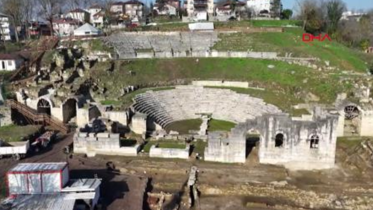 Batı Karadeniz’in tek antik tiyatrosu olma özelliğini taşıyan Konuralp bölgesindeki Konuralp Antik Tiyatrosu’nda tarihi eserlerin gün yüzüne çıkarılması için kazı çalışmaları devam ediyor. Kazılar çerçevesinde yaklaşık 2 bin yıl öncesine ait olduğu düşünülen ve pişmiş topraktan yapılan, üzerinde Roma rakamı ile V (5) yazan, ön yüzeyinde ise siyah firniş üzerinde kazıma tekniğinde gül motifi bulunan tiyatro bileti ile Dionysos heykeli asa başı Thyrsus bulundu.