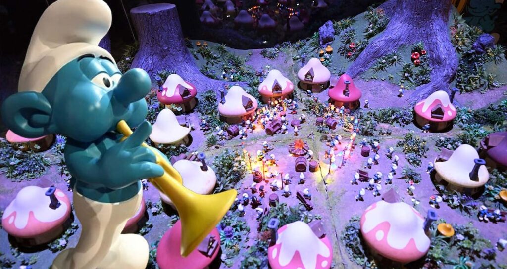 Brüksel’deki Expo Center’da 1500 metrekareyi aşan bir alana kurulan köyün girişinde Şirinler’in mantardan evleriyle dolu bir ormana adım atılıyor. Ormandan geçilerek Şirinler’in yaşadığı köye ulaşılıyor.