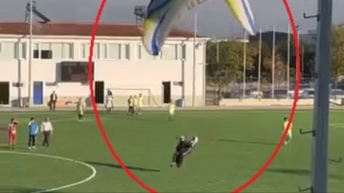 Bursa’nın İnegöl ilçesinde yaşayan Adem Keskin (40), paraşütle futbol karşılaşmasının yapıldığı sahaya indi. Futbolcular ve taraftarla büyük şaşkınlık yaşarken, Keskin, “Evime yakın olduğu için top sahasına iniş yapmak zorunda kaldım” dedi.