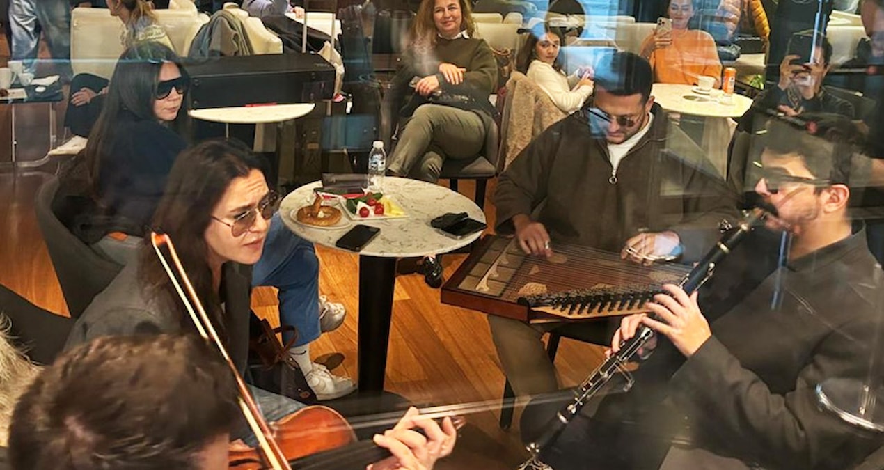 Sam ve orkestrası uçuş saatine kadar sahnede seslendirecekleri eserleri söylerken diğer yolcular da şarkılara eşlik etti.