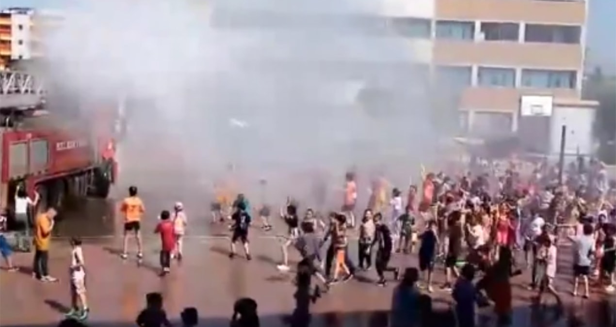 Ekip, okul bahçesinde sıcaktan bunalan öğrencilere itfaiye aracındaki suyu sıktı.