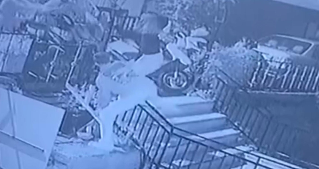 LASTİĞİNİ PATLATTIĞI MOTOSİKLETİ MERDİVENLERDEN ATTI
