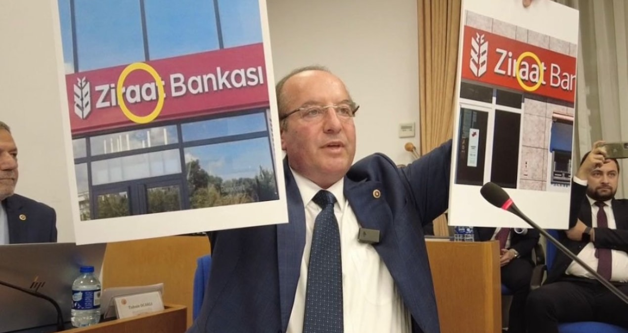 Ziraat Bankası şubelerindeki eski ve yeni tabelaların iki ayrı fotoğrafını komisyonda havaya kaldıran Akay, “Bu elimde gördüğünüz iki fotoğraf arasında tam 1 milyar liralık fark var. Biri eski amblem ikincisi sadece ‘a’ harflerinin şekli değiştirilerek yapılmış ikinci amblem. Yaklaşık 2 bin şubedeki tabelalar, dijital öğeler, banka hesap cüzdanları, kartvizitler, antetli kağıtlar, tüm materyaller değişiyor, bu da 954 milyon liralık bir savurganlığa mal oluyor” dedi.