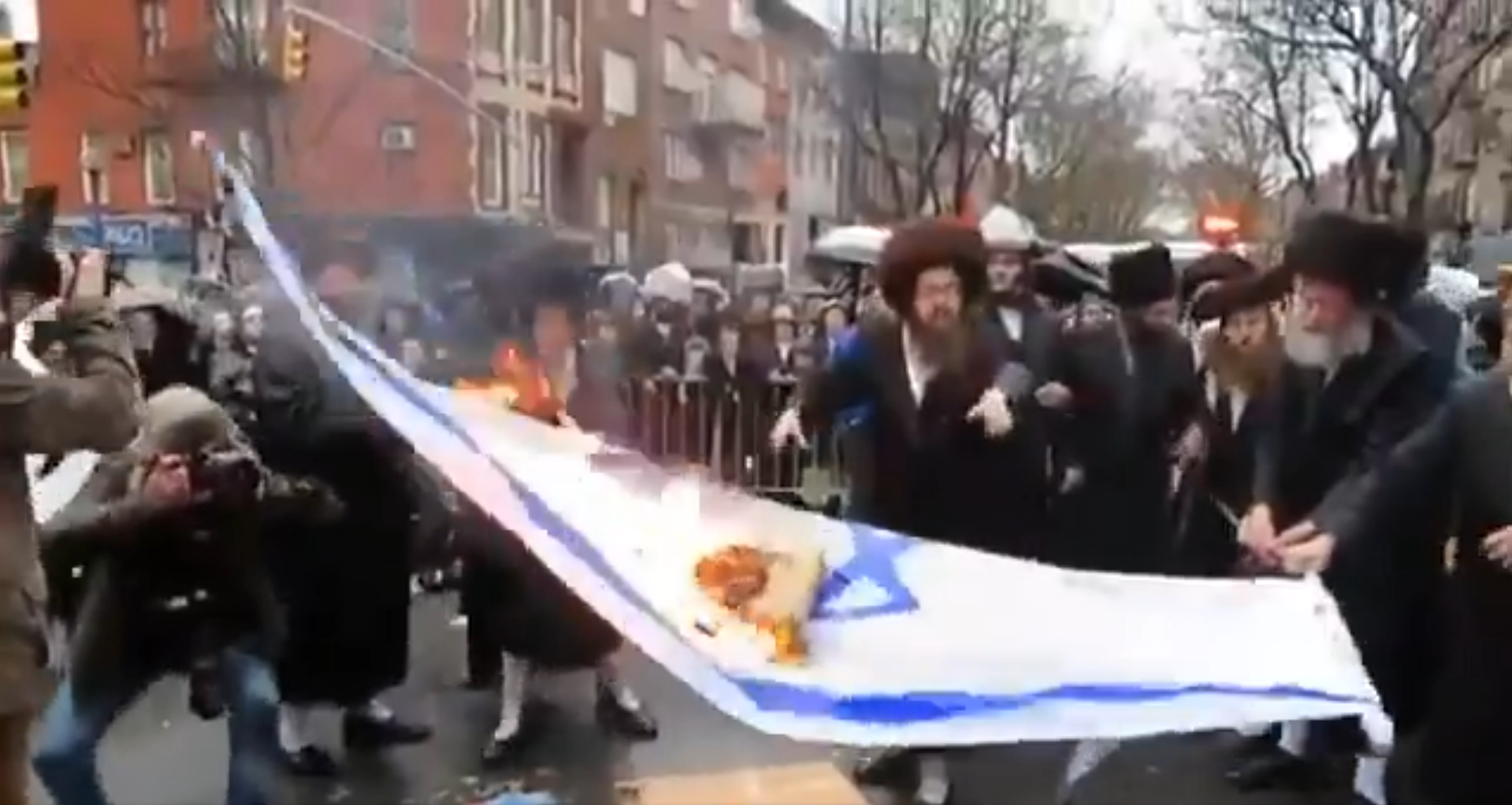 New York’ta ve Kudüs’te kaydedilen görüntülerde, sokaklarda toplanan Haredi Yahudiler bayrakları çıralarla ateşe veriyor, yanan bayrakları sallayarak slogan atıyor, şarkı söylüyor.