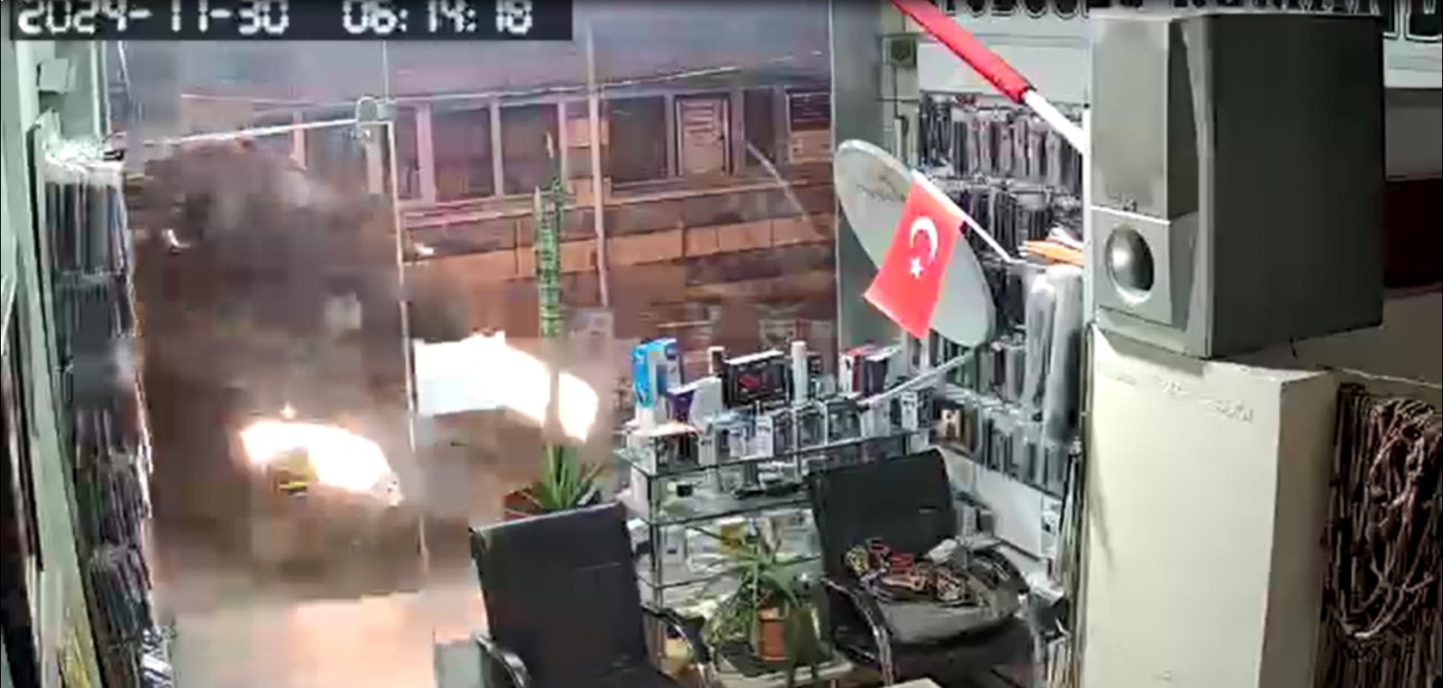 Rize’de yokuştan inerken sürücüsünün direksiyon kontrolünü yitirdiği 61 FL 993 plakalı hafif ticari araç, kaldırıma çıkıp, yol kenarındaki elektronik ürün onarım ve satışı yapılan iş yerine girdi.